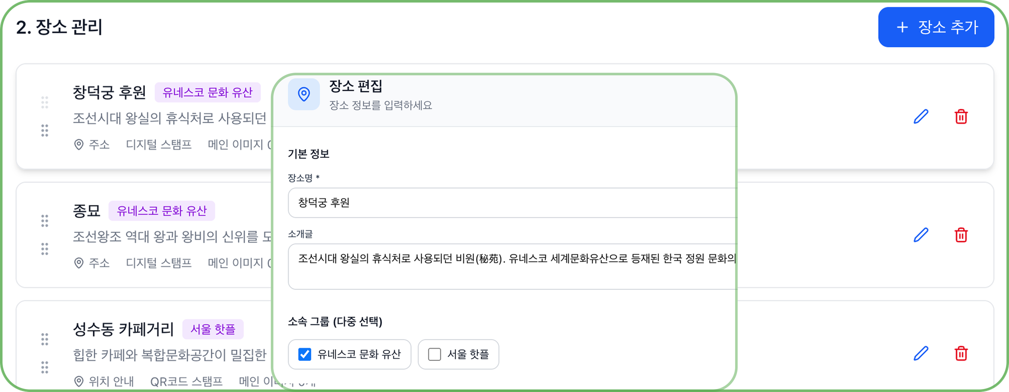 - 장소를 그룹화하여 수십개, 수백개의 장소를 포함하는 스탬프 투어를 운영할 수 있습니다.