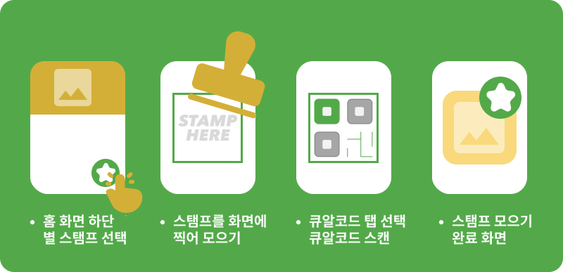홈에서 하단 별 로고 선택 > 디지털스탬프를 화면에 찍어 스탬프를 모으기, 또는 스탬프 모으기 페이지에서 큐알코드 탭을 선택후 스캔하여 스탬프를 모을 수 있습니다. 스탬프를 모으면, 해당 장소 사진과 함께 스탬프 완료 화면으로 저장되며, 스탬프 북이나 스탬프 리스트에서도 동일하게 화면 전환됩니다.